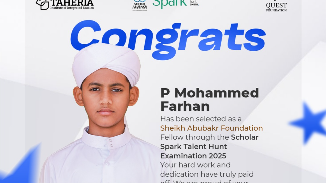 P Mohammed Farhan, a student of Darul Uloom Taheria, Guntakal, has achieved a significant academic milestone by being selected as a Sheikh Abubakr Foundation Fellow. This prestigious recognition comes through his outstanding performance in the Scholar Spark Talent Hunt Examination 2025.